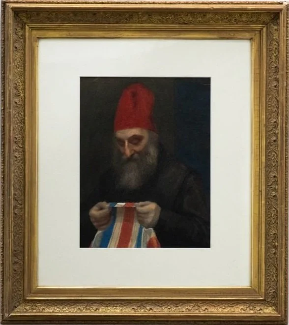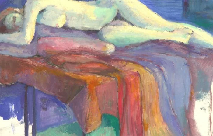 It’s rare to find a life drawing without a great bit of drapery, this colourful acrylic study takes pride in adhering to this tradition.