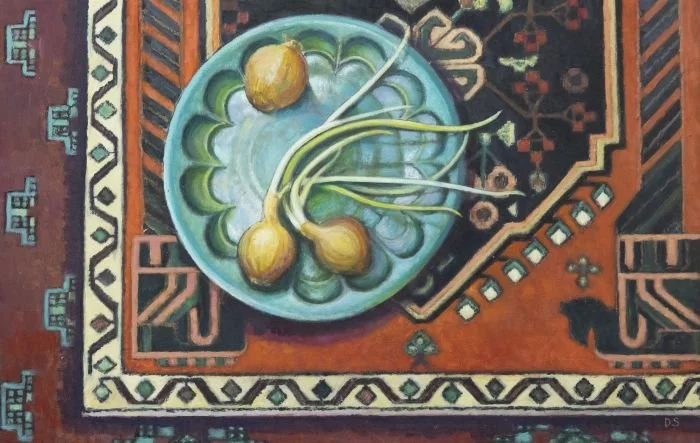 In the best possible way, there’s a lot going on here. The brightly coloured, boldly patterned cloth weaves through the scene, loudly connecting each still life object with another. The more we look at it, the more we love it.
