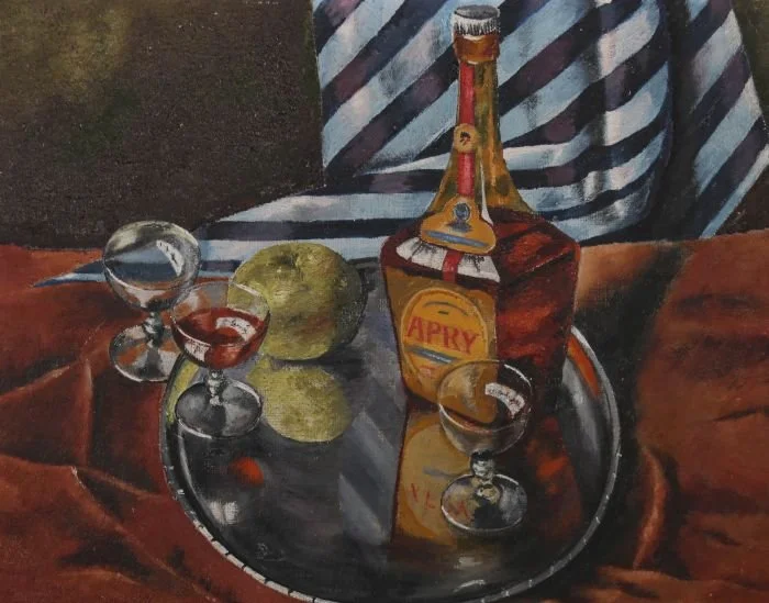 Mid 20th Century Oil - Still Life of Liquor Glasses and an Apple